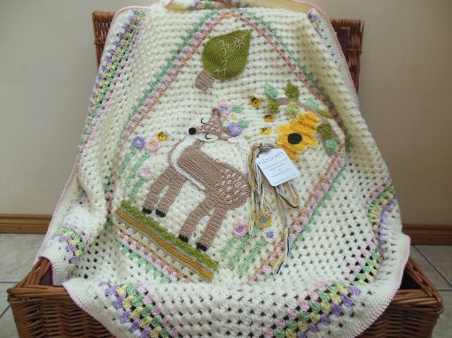 The appliques are made up of 58 individual components. Even before being carefully hand stitched to the blanket completing the magical woodland forest picture. I do not use any plastic eyes, noses and such like on my creations. Simply wool and cotton making it safer for little ones. For each blanket made I use different mediums of knit, crochet and embroidery. High quality wool and cottons are intertwined to achieve a luxury finish that will be treasured for years to come.