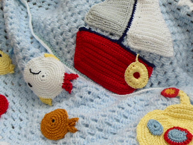 Specifically I have both designed and handmade the baby blanket with thoughts of a new little sailor in mind! It has seagulls hovering over a little sailboat. Then underneath the sea a submarine and various sea fish including an octopus! swimming around.